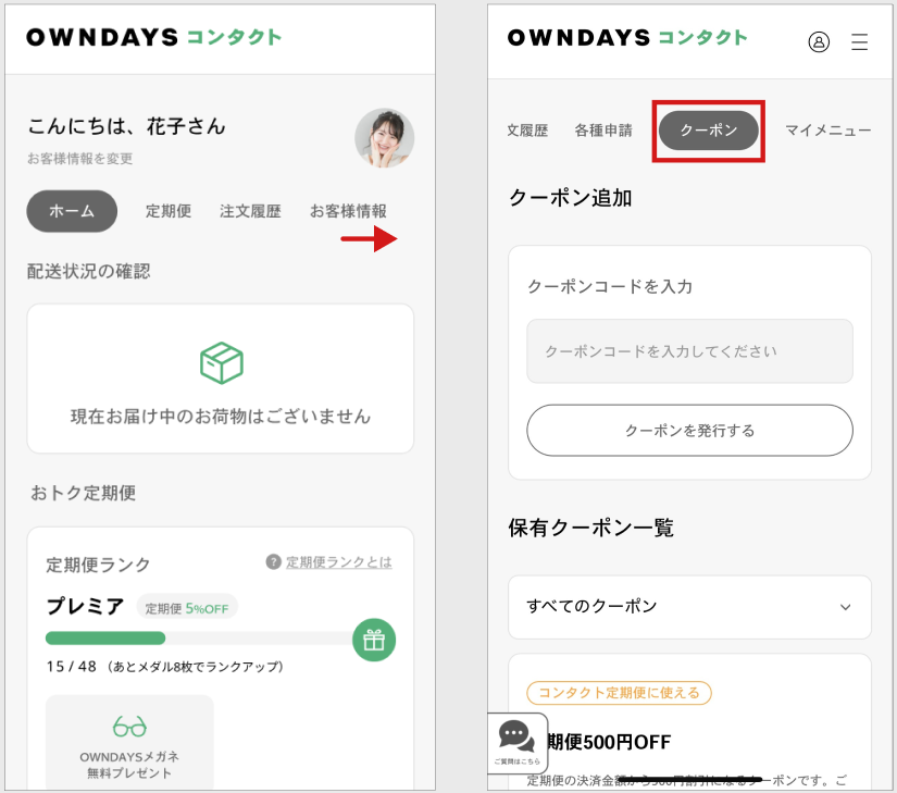 マイページ>ホーム>クーポン から現在保有中のクーポンの確認が可能です。
