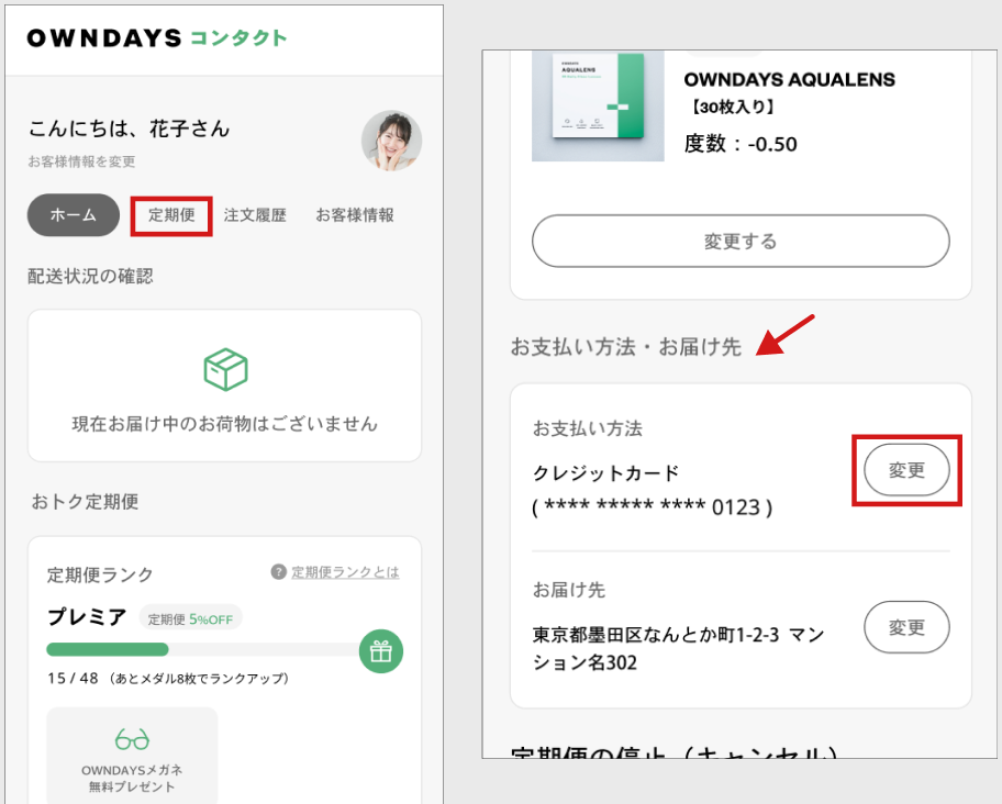 マイページホーム>定期便>定期便の設定>お支払い方法・お届け先欄の「変更」ボタンから定期便のお支払い方法を変更いただくことが可能です。
