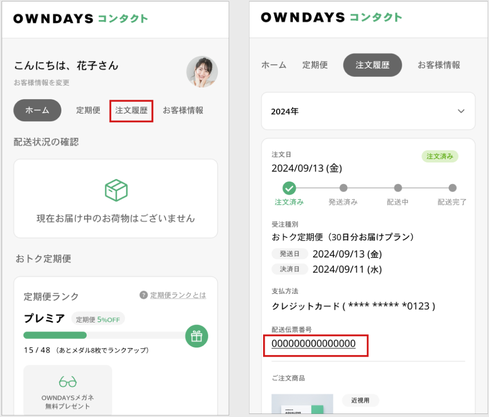 マイページ > 注文履歴から、該当の注文の配送伝票番号をクリックいただくことで、配送業者の追跡サービスにアクセスいただけます。