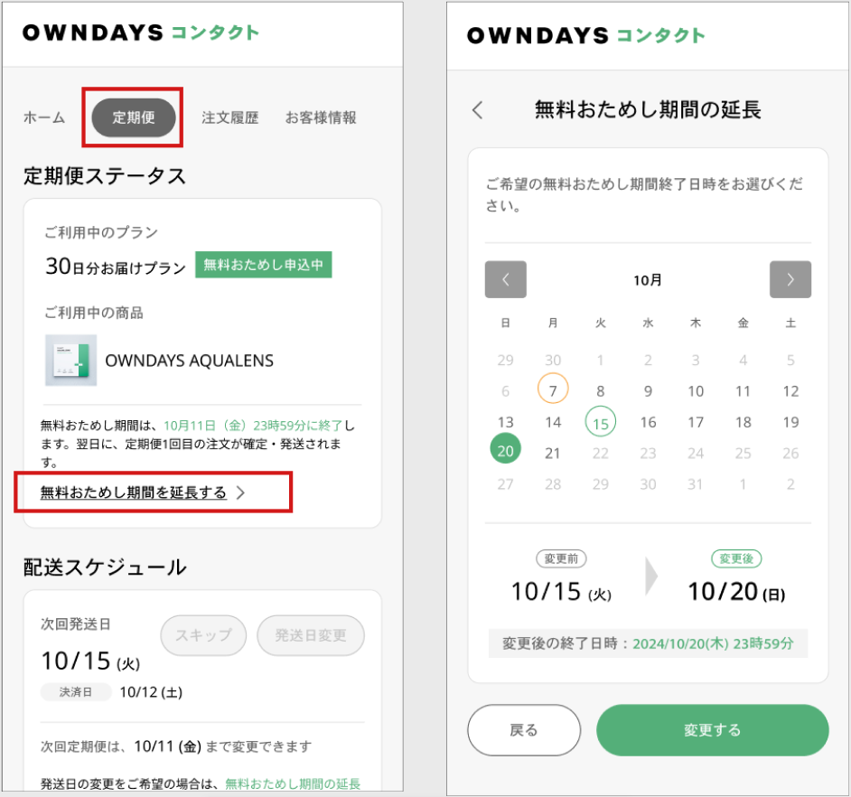 マイページホーム>定期便>定期便ステータス欄の「無料おためし期間を延長する」からおためし期間の延長が可能です。