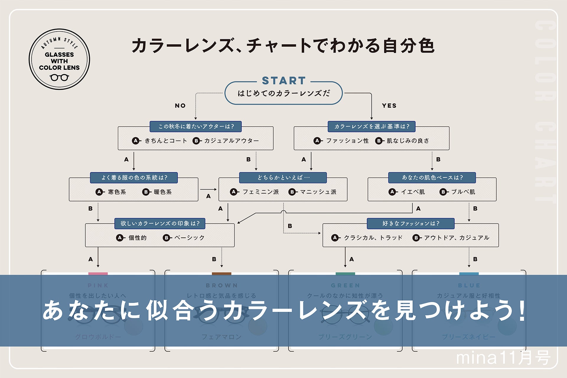 秋服に似合うカラーレンズを探して。「mina. 2023年11月号」にて似合うメガネがわかるチャート診断公開中!