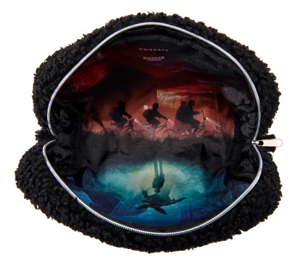 80年代のポップカルチャーに着想を得た、レトロなフリースポーチ。外側のアイコニックなロゴとは対照的に、内側には裏側の世界の不気味でミステリアスな世界観を表現しました。