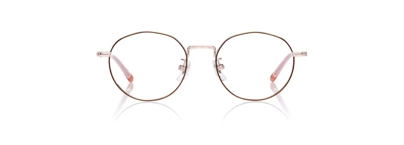 Junni「JU1024G-4S」はフレーム上部は多角形、下部はラウンドという遊び心のあるフォルムが特徴のメタルフレーム。丸メガネでは物足りないお子さまにも、角すぎないデザインで安心して選べる一本です。モダン先やテンプルからのぞく芯金にはニュアンスカラーを施し、モダン先はマット加工でやわらかくにじむような色合いを表現しました。トレンド感のある、大人顔負けのクオリティです。