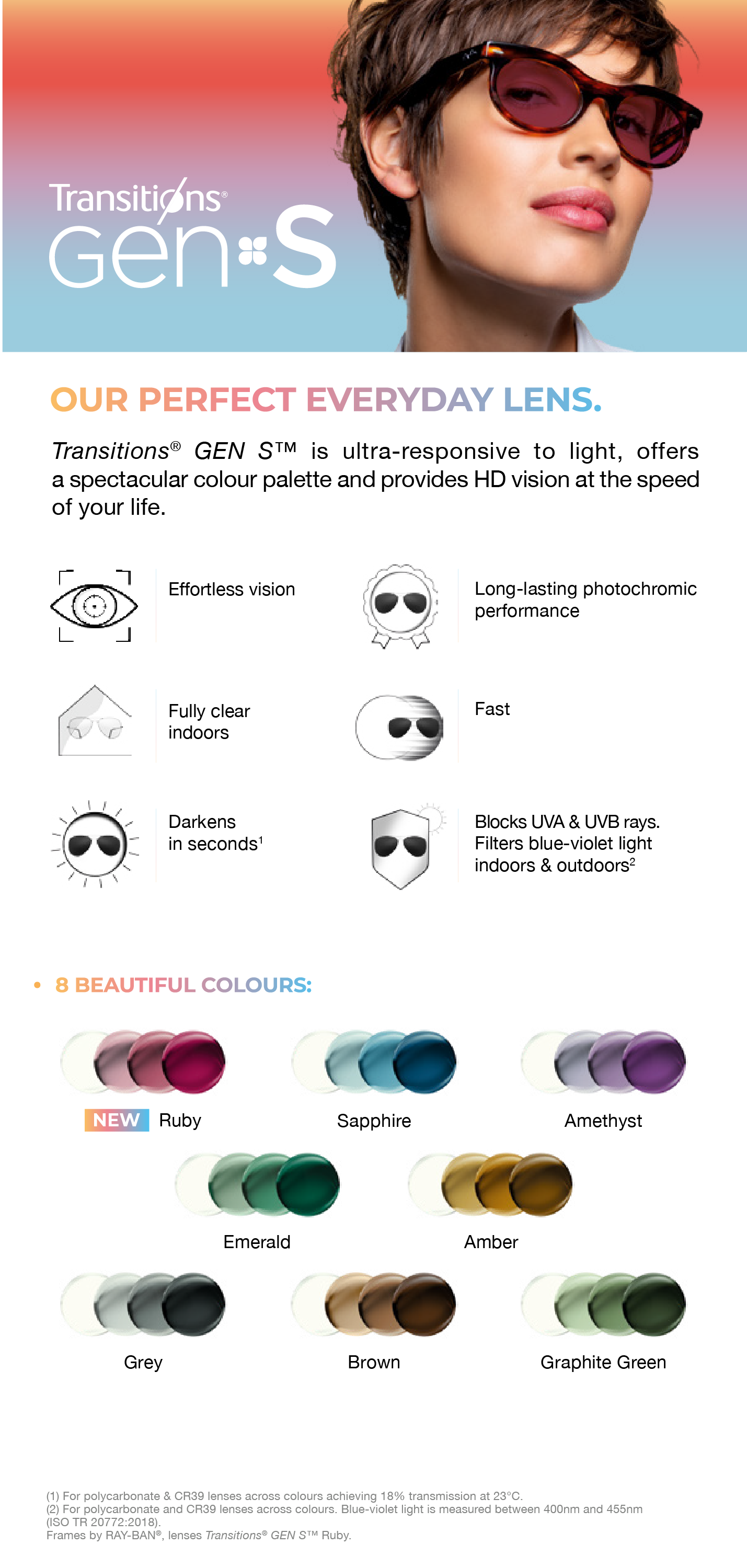 Protect your eyes in style with the latest Transitions® GEN S™ lenses, made to fit your everyday life.
