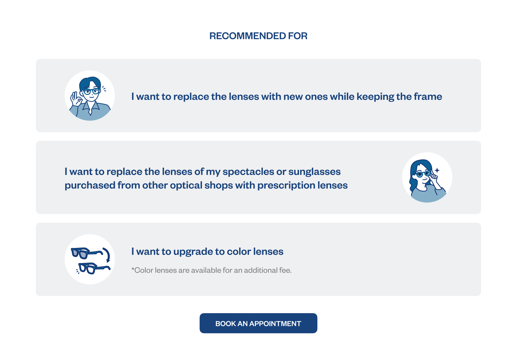 The lens replacement service is subject to the condition and type of your frame. If the frame is damaged or has a unique design that won't support new lenses, it may not be eligible.
