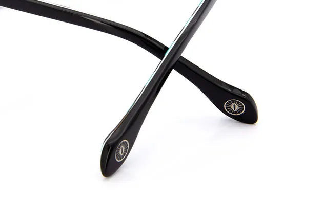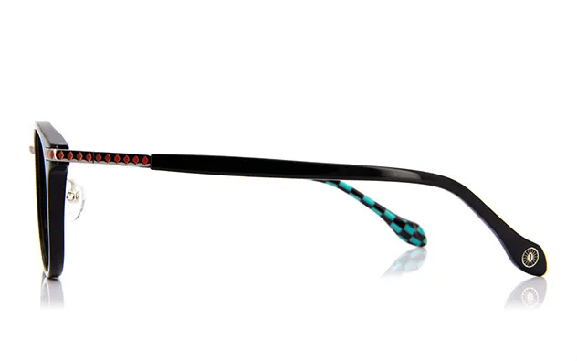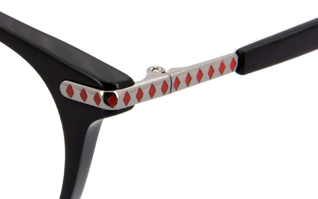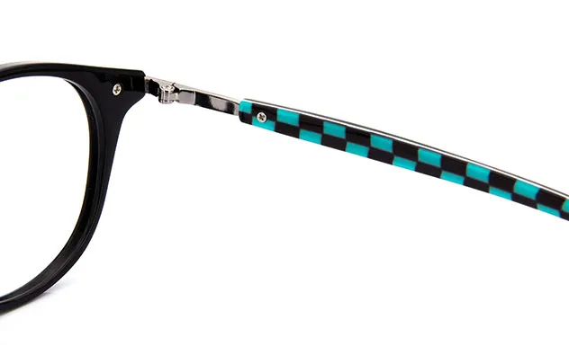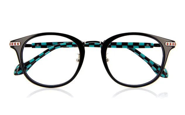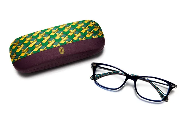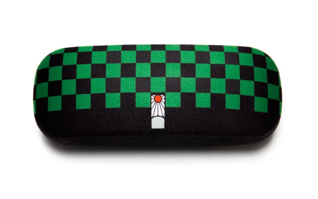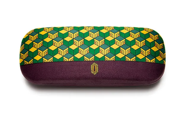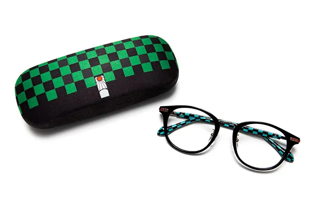 アセテート生地とメタル素材を使用した顔馴染みしやすいボストン型フレーム。炭治郎の日輪刀をイメージした艶のある黒色に、柄の赤色が目元のアクセントになっています。また、テンプル(耳にかける部分)には、日輪刀の鍔の形をしたメタルパーツが埋め込まれており、内側はトレードマークの市松模様があしらわれています。