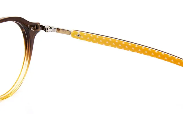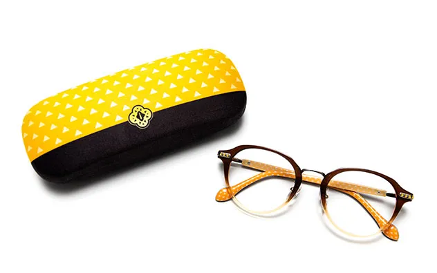 フロントのグラデーションと近年流行のクラウンパント型が特徴的なおしゃれな一本。善逸の日輪刀の柄の黄色が目元のアクセントになっており、テンプルに鍔の形をしたメタルパーツが埋め込まれています。内側には善逸の羽織りのデザインである鱗(うろこ)模様があしらわれています。