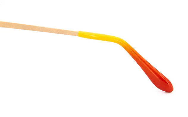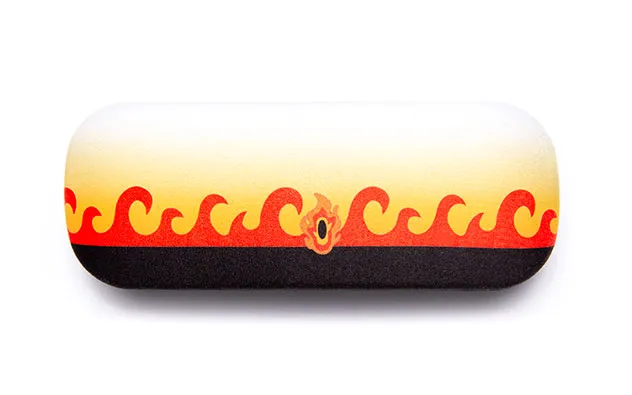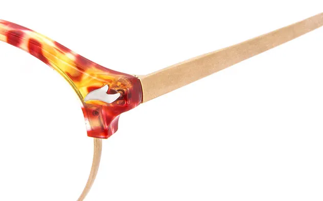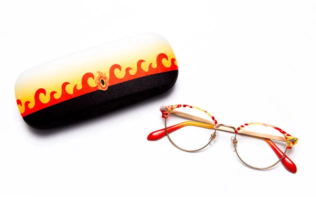 炎が凝縮されたかのようなデザインのブロウ型フレーム。煉獄の特徴的な眉毛の形をしたメタルパーツがポイントとなっており、高級感のあるシャンパンゴールドのフレームは煉獄の気高さを象徴しています。フレームの先端にも炎の染色を施し、さらにワンポイントで「滅」の文字をあしらいました。誇り高き剣士の赤く燃ゆるような生きざまを表現した、心を燃やす一本です。