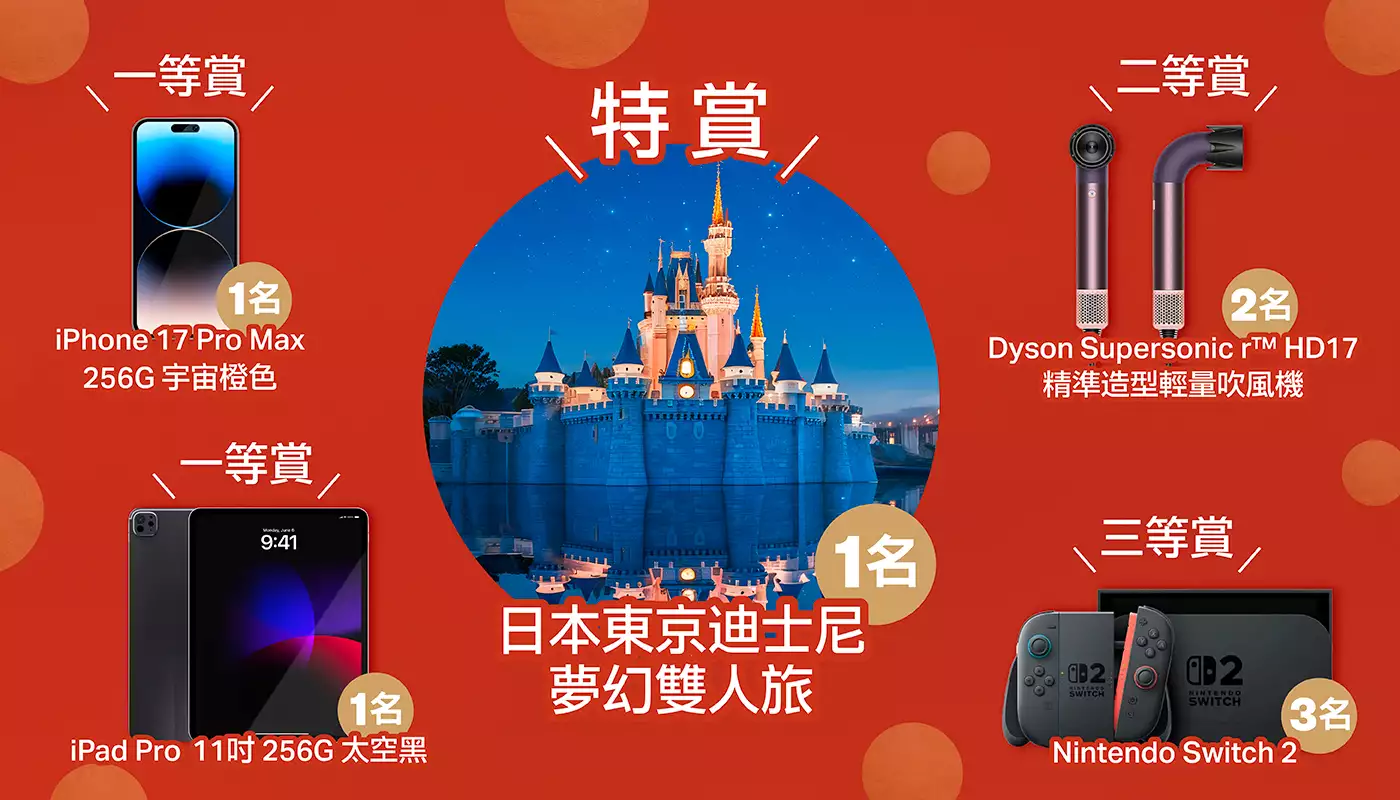 *特賞「日本東京迪士尼之旅雙人遊」市價為新台幣50,000元,若實際旅遊行程費用超過市價,差額部分需由中獎者自行負擔。