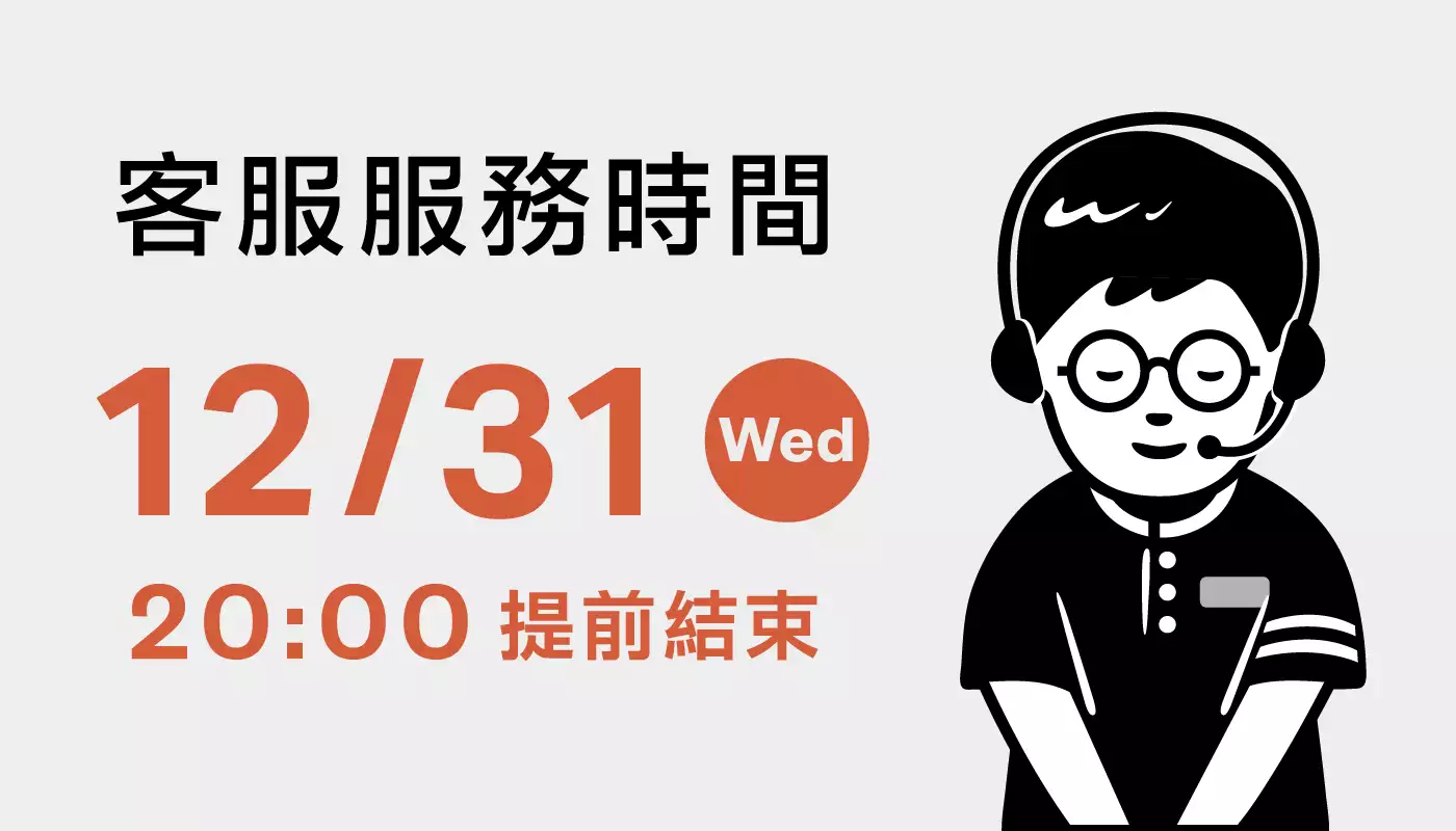 12/31(三)因配合公司營運,今日 提早於20:00結束客服中心服務。
